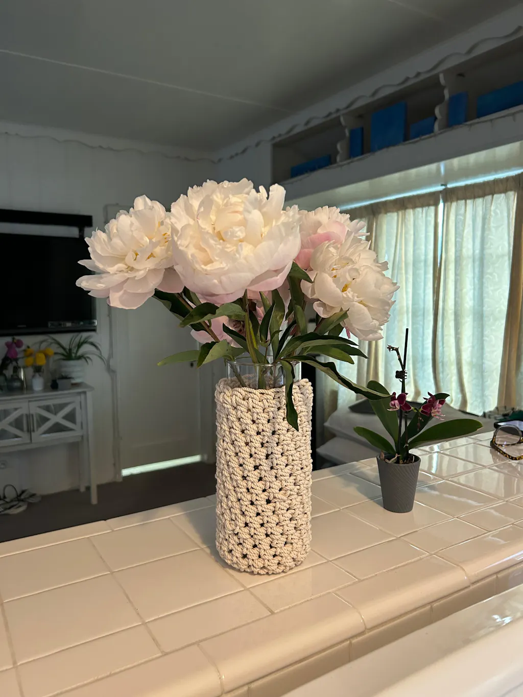 I love the look of flowers emerging from the texture and structure of crochet—it’s both surprising and delightful. The glass vase becomes almost invisible, making the rope seem the actual container. Whether for a teacher, Mother's Day, a thoughtful hostess gift, a special surprise for a best friend, or for your own home, it’s a quick and easy way to add your own creative and personal touch to any floral display, or gift.